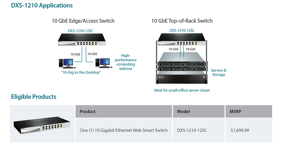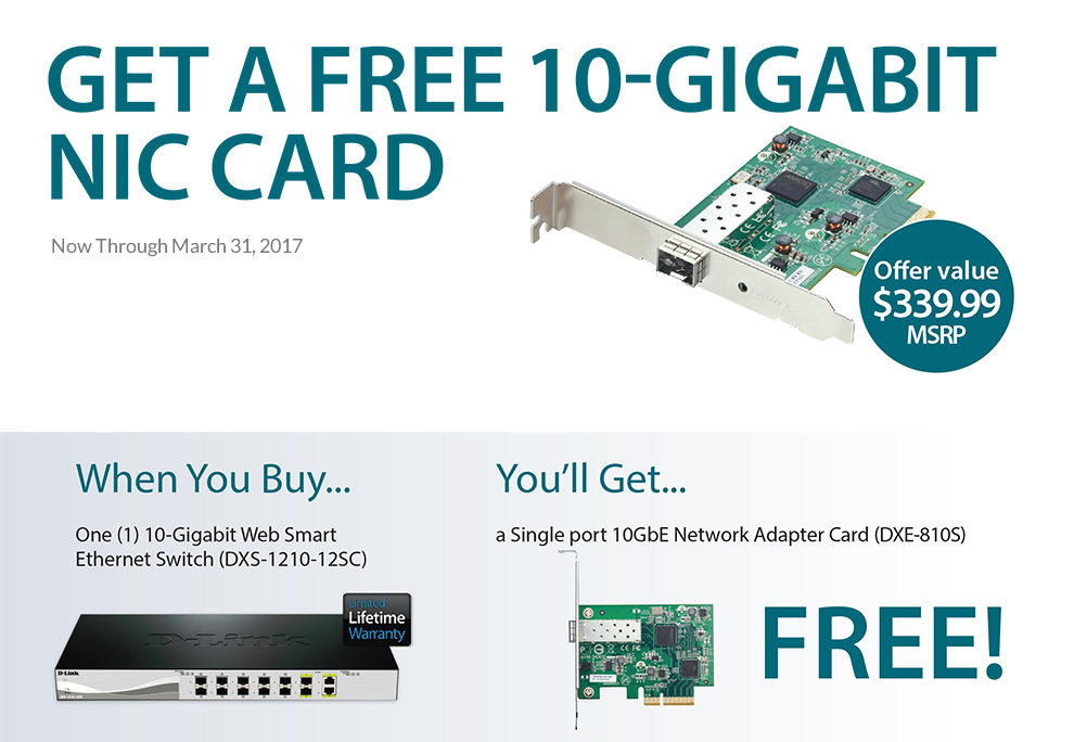 Take advantage of this great promotion while you can. From now until March 31, 2017, when you buy a new DXS-1210-12SC 10-Gigabit Web Smart switch from a eligible distributor, you will get a free 10GbE NIC.*